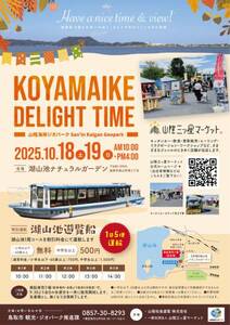 湖山池の風光明媚な景観や、周囲の歴史を知ることができる湖山池遊覧船をもっと多くの皆さんに幅広く知ってもらうため、普段は、予約運航している遊覧船のワンコイン定時運航や、飲食やクラフトなど山陰三ッ星マーケットの出店を伴う利用促進イベントを開催いたします! |