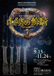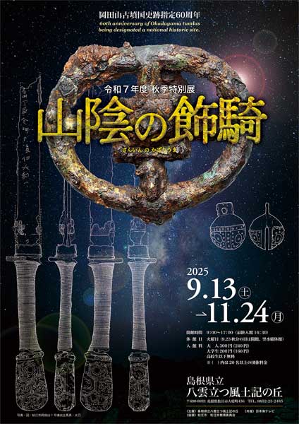 岡田山古墳が国の史跡に指定されて60年、1号墳出土品の一部が国の重要文化財に指定されて40年を迎える2025年、岡田山1号墳出土品をはじめ、山陰の馬具や装飾大刀の美しさが、力強さが、風土記の丘を駆けめぐる。 |