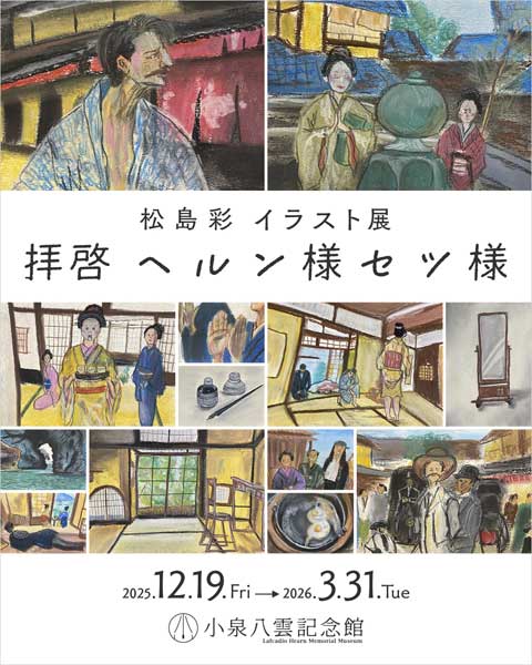 小泉八雲記念館では、松島彩さんのイラスト展示を通して、ヘルンとセツ、そして「ばけばけ」のさまざまなシーンに対する想いを、ヘルンとセツに宛てた手紙とともに紹介します。