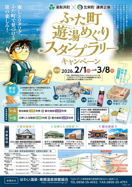 ●お問い合わせ先: 0858-35-4052(はわい温泉・東郷温泉旅館組合)